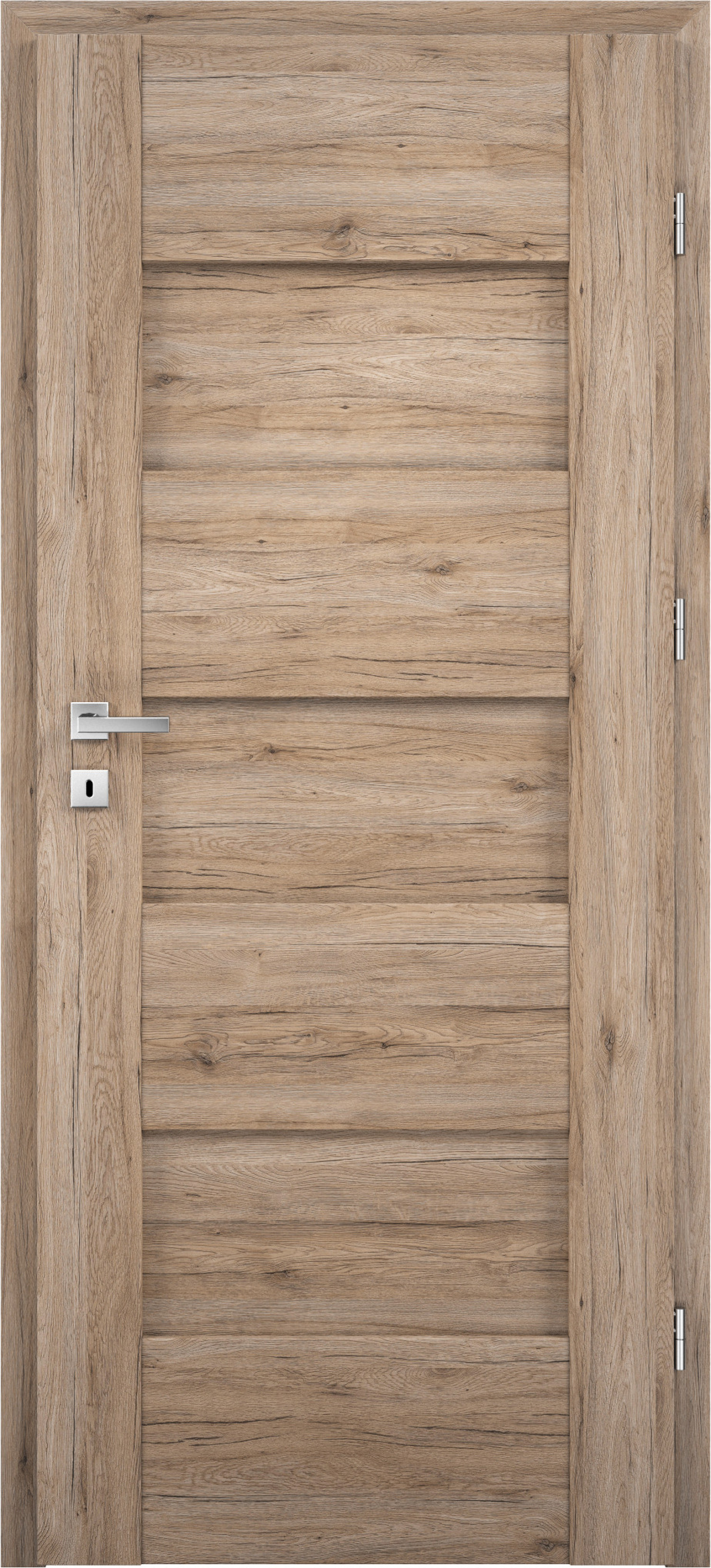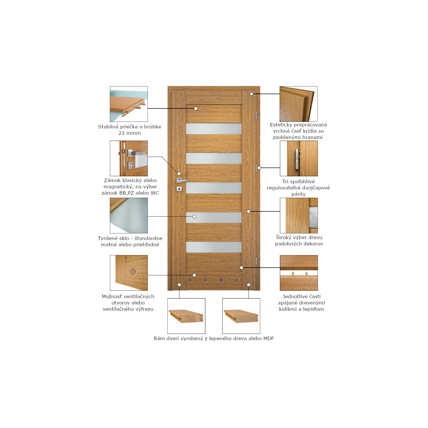Rám dverí vyplnený lepeným drevom, ktorý je obložený tenkými HDF doskami pokrytými povrchovou úpravou PREMIUM Decor alebo MDF rám potiahnutý povrchovou úpravou Optim Decor, hrúbka dverného krídla je 40 mm.