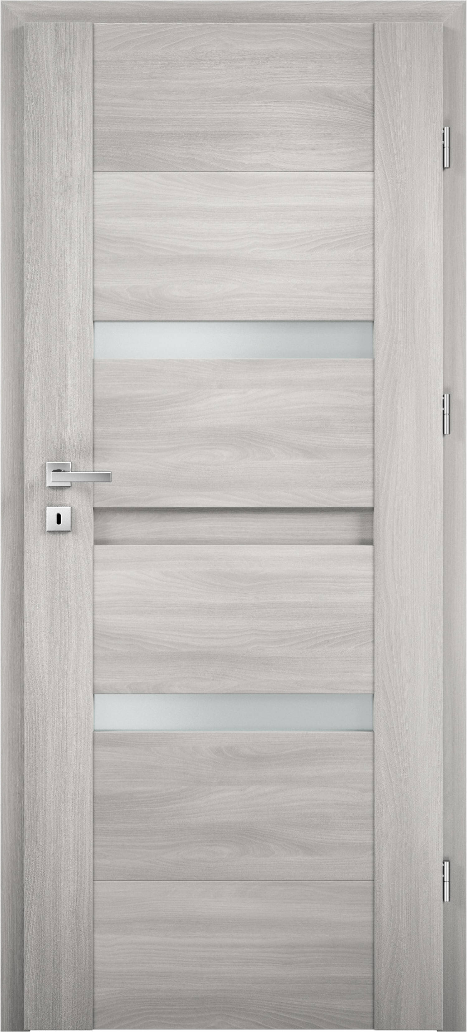Rám dverí vyplnený lepeným drevom, ktorý je obložený tenkými HDF doskami pokrytými povrchovou úpravou PREMIUM Decor alebo MDF rám potiahnutý povrchovou úpravou Optim Decor, hrúbka dverného krídla je 40 mm.