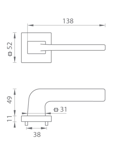 Rozetová kľučka na interiérové dvere s hranatou rozetou je vyrobená z materiálov vysokej kvality - mosadz a je povrchovo upravená. Rozeta má rozmery 52 mm x 52 mm a štandardnú hrúbku 11 mm.