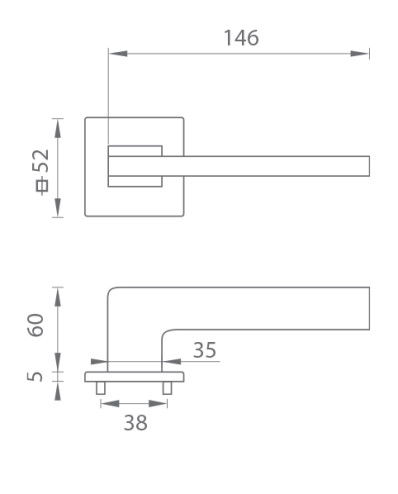 Rozetová kľučka na interiérové dvere s hranatou rozetou je vyrobená z materiálov vysokej kvality - zamak a je povrchovo upravená. Rozeta má rozmery 52 mm x 52 mm a hrúbku len 5 mm.