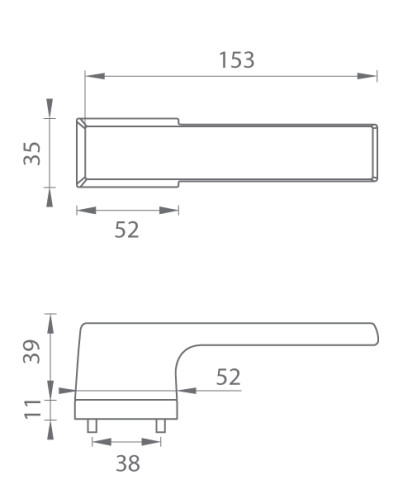 Rozetová kľučka na interiérové dvere s obdĺžnikovou rozetou je vyrobená z materiálov vysokej kvality - zamak a je povrchovo upravená. Rozeta má rozmery 52 mm x 35 mm a štandardnú hrúbku 11 mm. Samotná rozeta je súčasťou dizajnu kľučky.